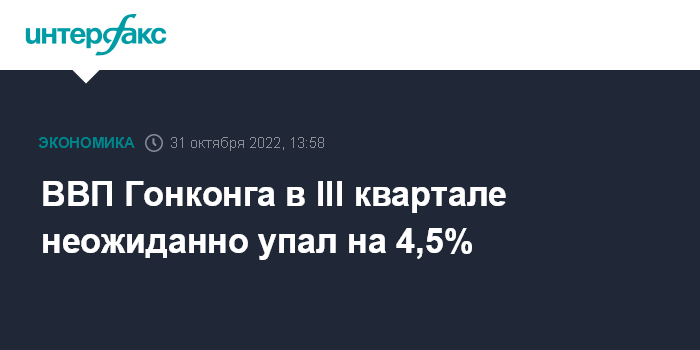 Москва. 31 октября. INTERFAX.RU - В III квартале 2022 года ВВП Гонконга неожиданно упал на 4,5% в годовом измерении, сообщило статистическое управление. Аналитики ожидали роста экономики региона на 0,7%, сообщает Trading Economics.