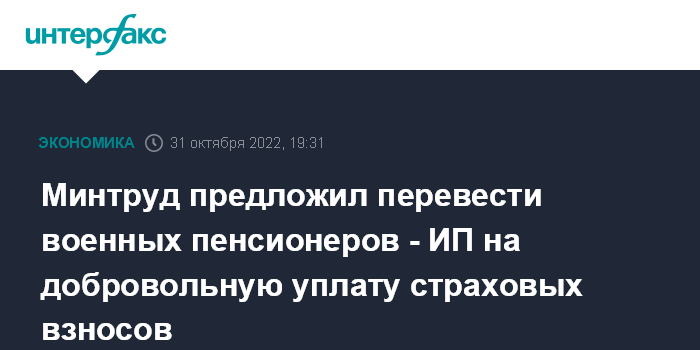 Москва. 31 октября. INTERFAX.RU - Минтруд разработал изменения в закон "Об обязательном пенсионном страховании в РФ", в соответствии с которым военных пенсионеров - индивидуальных предпринимателей предлагается освободить от уплаты страховых взносов на обязательное пенсионное страхование.