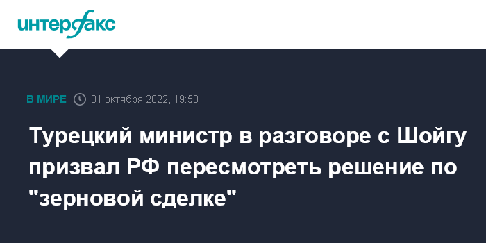 Москва. 31 октября. INTERFAX.RU - Министр обороны Турции Хулуси Акар в ходе телефонного разговора с главой Минобороны России Сергеем Шойгу призвал Москву пересмотреть решение о приостановке участие в "зерновой сделке", сообщают турецкие СМИ.