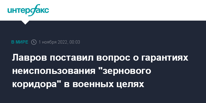 "В ходе беседы С.В.Лавров обозначил необходимость обеспечить получение гарантий со стороны Украины о неиспользовании гуманитарного коридора и украинских портов, определенных в интересах вывоза сельскохозяйственной продукции, для ведения боевых действий против Российской Федерации. Только при таких условиях возможно обсуждение вопроса о возобновлении движения по коридору безопасности, определенному "Черноморской инициативой", - отмечается в сообщении.