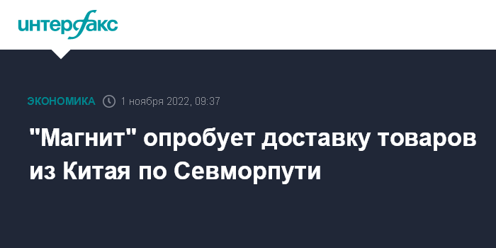 Москва. 1 ноября. INTERFAX.RU - Ритейлер "Магнит" начал тестировать доставку товаров из Китая в Петербург по Северному морскому пути.