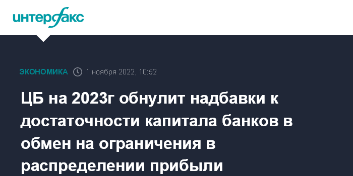 ЦБ на 2023г обнулит надбавки к достаточности капитала банков в обмен на ограничения в распределении прибыли