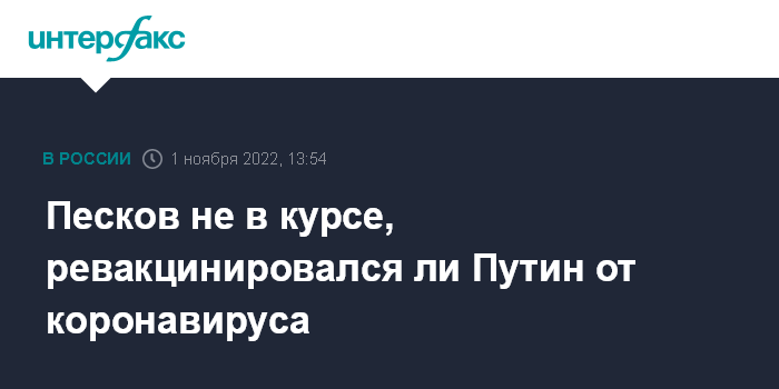 Москва. 1 ноября. INTERFAX.RU - Пресс-секретарь президента РФ Дмитрий Песков пока не знает, ревакцинировался ли Владимир Путин от коронавируса.