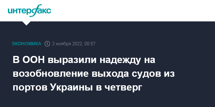 Москва. 2 ноября. INTERFAX.RU - Постоянный координатор ООН в Совместном координационном центре в Стамбуле Амир Абдулла надеется на возобновление движения сухогрузов с украинским продовольствием в четверг.