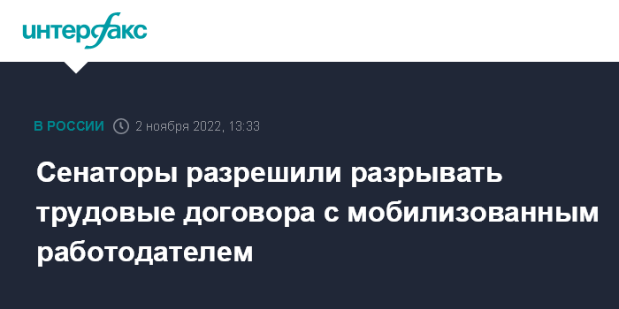 Москва. 2 ноября. INTERFAX.RU - Совет Федерации одобрил закон о прекращении трудовых договоров с сотрудниками обществ с ограниченной ответственностью, чей единственный собственник-гендиректор был мобилизован, но не передал никому управление компанией.