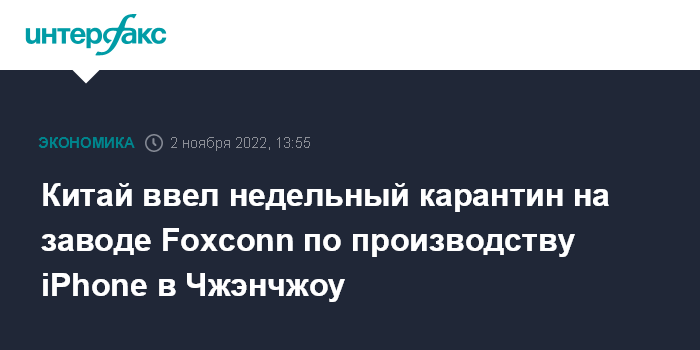 Москва. 2 ноября. INTERFAX.RU - Власти Китая ввели семидневный локдаун в районе завода по производству iPhone тайваньской Foxconn Technology Group в городе Чжэнчжоу, сообщает агентство Bloomberg.