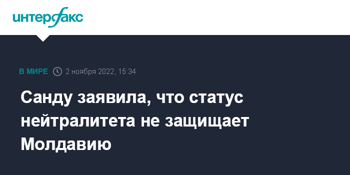 Москва. 2 ноября. INTERFAX.RU - Президент Молдавии Майя Санду заявила, что заложенный в Конституции статус нейтралитета страны ее не защищает, но изменить его можно только при широкой поддержке народа. Она заявила об этом румынскому телеканалу Digi24.