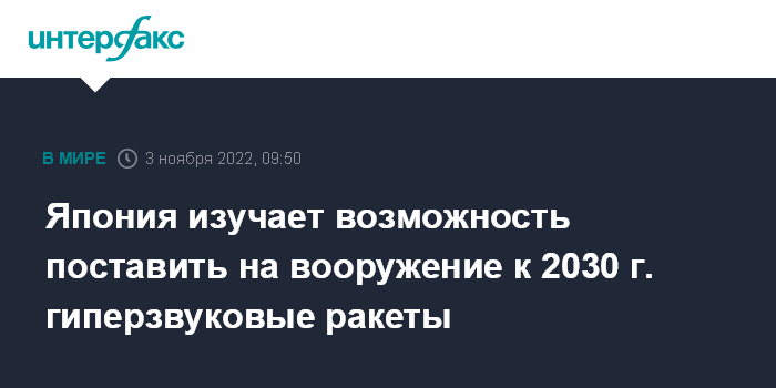 Москва. 3 ноября. INTERFAX.RU - Минобороны Японии рассматривает перспективы оснащения японских военных к 2030 году гиперзвуковыми ракетами, сообщает в четверг издание Nikkei.
