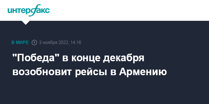 Москва. 3 ноября. INTERFAX.RU - Авиакомпания "Победа" (входит в группу "Аэрофлот") 23 декабря возобновит регулярные рейсы Москва - Гюмри (Армения), сообщила представитель компании журналистам.