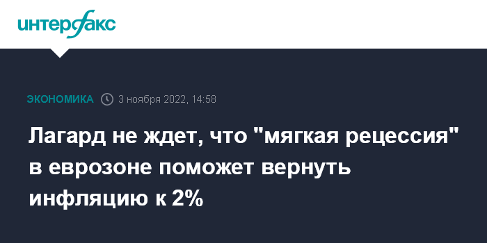Москва. 3 ноября. INTERFAX.RU - Председатель Европейского центрального банка Кристин Лагард видит возможность "мягкой рецессии" в экономике еврозоны, однако не считает, что спад активности сам по себе сможет замедлить инфляцию в регионе до целевых 2%.