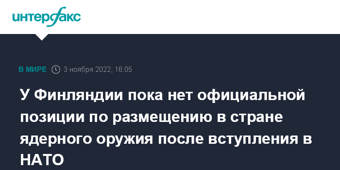 "В предложении не рассматривается вопрос о том, будет ли развернуто ядерное оружие в Финляндии после присоединения. Однако в предложении подчеркивается, что Финляндия поддерживает ядерное разоружение всех стран. В то же время, как государство-член НАТО, Финляндия будет охвачена защитой ядерного оружия альянса", - приводит позицию правительства портал Yle.