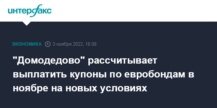 Москва. 3 ноября. INTERFAX.RU - Домодедово", в августе в срок не перечислившее два купонных платежа по выпускам долларовых еврооблигаций, получило согласие инвесторов на изменение условий обслуживания евробондов и теперь рассчитывает осуществить выплату купонов в ноябре.