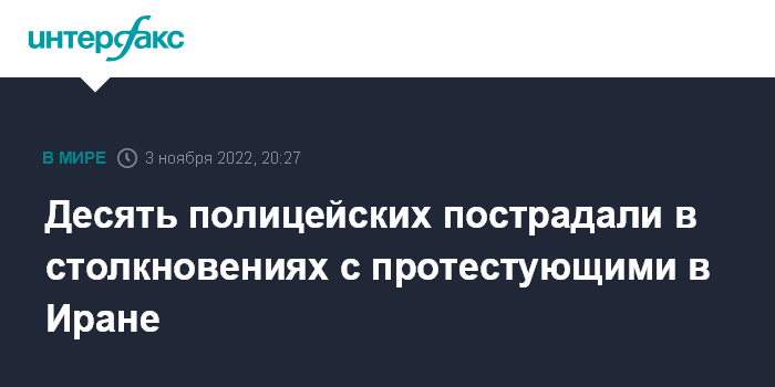 Москва. 3 ноября. INTERFAX.RU - В пригороде Тегерана - Карадже - произошли столкновения полиции с протестующими, как сообщает IRNA, травмы получили десять полицейских, некоторые находятся в тяжелом состоянии.