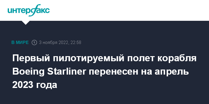 Москва. 3 ноября. INTERFAX.RU - Первый испытательный пилотируемый полет космического корабля CST-100 Starliner компании Boeing к Международной космической станции (МКС) перенесен с февраля на апрель 2023 года, сообщает NASA.