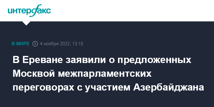 Москва. 4 ноября. INTERFAX.RU - Ереван получил от Москвы предложение о проведении трехсторонних межпарламентских переговоров с Баку, заявила "Интерфаксу" пресс-секретарь спикера парламента Армении Цовинар Хачатрян.