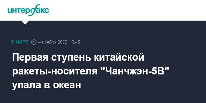 Москва. 4 ноября. INTERFAX.RU - Массивная первая ступень ракеты-носителя "Чанчжэн-5B", которая на этой неделе отправила лабораторный модуль "Мэньтянь" к орбитальной станции Китая "Тяньгун", упала в Тихий океан в результате неконтролируемого возвращения в атмосферу Земли, сообщило в пятницу Управление программы пилотируемых полетов КНР (CMSA).