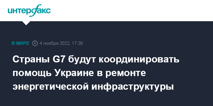Москва. 4 ноября. INTERFAX.RU - Министры иностранных дел стран G7 сообщили в пятницу о решении учредить координационный механизм по помощи Украине в восстановлении энергетической инфраструктуры и водоснабжения.