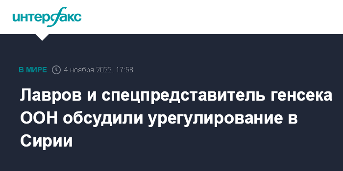 Москва. 4 ноября. INTERFAX.RU - Глава МИД РФ Сергей Лавров и спецпредставитель генерального секретаря ООН по Сирии Гейр Педерсен на встрече в Абу-Даби обсудили ситуацию вокруг Сирии, в том числе работу межсирийского Конституционного комитета, сообщает сайт МИД РФ.