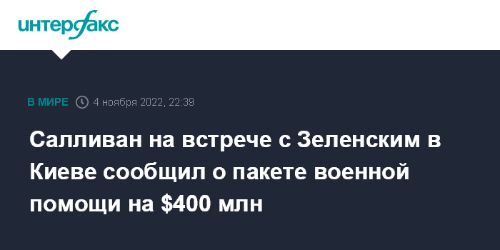 Москва. 4 ноября. INTERFAX.RU - Советник Джо Байдена по нацбезопасности Джейк Салливан в пятницу посетил Киев, где встретился с представителями руководства Украины и заявил о выделении пакета военной помощи на сумму $400 млн, сообщает Белый дом.