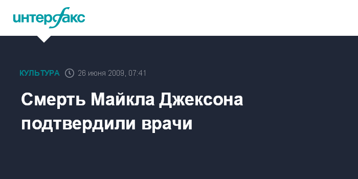 Москва. 26 июня. INTERFAX.RU - Врачи подтвердили кончину одного из величайших американских певцов ХХ в. Майкла Джексона, сообщает CNN. В возрасте 50 лет он скончался в медицинском центре UCLA в Калифорнии. Предположительно причиной смерти стал сердечный приступ, однако окончательно точка в вопросе об этом будет поставлена после вскрытия, которое будет произведено в пятницу.