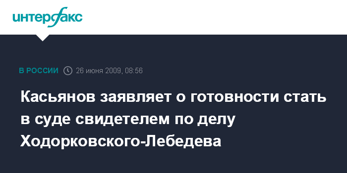 Москва. 26 июня. INTERFAX.RU - Экс-премьер России, лидер Российского народно-демократического союза Михаил Касьянов готов придти в суд по делу экс-главы "ЮКОСа" Михаила Ходорковского и экс-главы "МЕНАТЕПа" Платона Лебедева в качестве свидетеля. Кроме того Касьянов отметил, что, еще будучи главой правительства с первого дня ареста Лебедева и Ходорковского, осуждал действия правоохранительных органов.