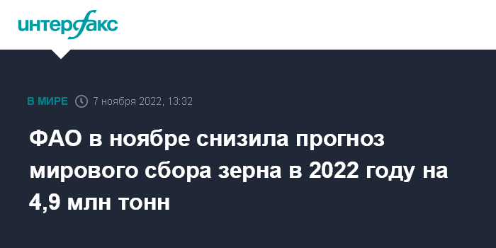 ФАО в ноябре снизила прогноз мирового сбора зерна в 2022 году на 4,9 млн тонн