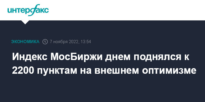 Москва. 7 ноября. INTERFAX.RU - Российский рынок акций растет днем в понедельник, продолжая отыгрывать сохраняющийся с пятницы оптимизм внешних площадок на ожиданиях ослабления антиковидных ограничений в Китае, индекс МосБиржи поднялся к рубежу 2200 пунктов.