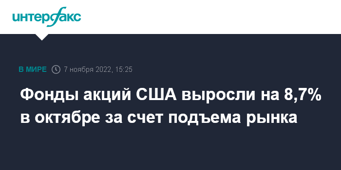 Москва. 7 ноября. INTERFAX.RU - Средняя стоимость фондов американских акций выросла на 8,7% в октябре на фоне роста фондового рынка, следует из данных Refinitiv Lipper.
