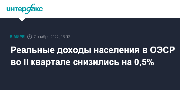 Москва. 7 ноября. INTERFAX.RU - Реальные доходы населения стран Организации экономического сотрудничества и развития (ОЭСР) во втором квартале 2022 года сократились на 0,5%, несмотря на рост реального ВВП в расчете на душу населения на 0,3%.