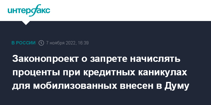 Москва. 7 ноября. INTERFAX.RU - Регионы просят пересмотреть принятый Госдумой в октябре законопроект о предоставлении каникул по потребительским кредитам мобилизованным гражданам и отменить норму, согласно которой в течение срока кредитных каникул на размер основного долга начисляются проценты в размере 2/3 от среднерыночного значения полной стоимости потребительского кредита.