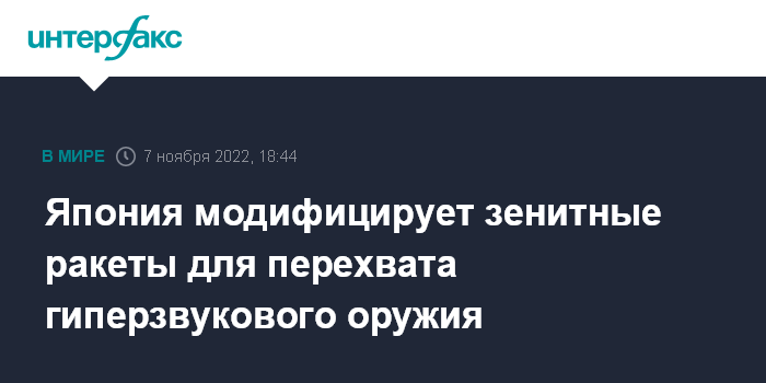 Москва. 7 ноября. INTERFAX.RU - Японские военные намереваются модифицировать зенитные ракеты, стоящие сейчас на вооружении, чтобы с их помощью можно было перехватывать гиперзвуковое оружие, сообщает в понедельник Kyodo со ссылкой на свой источник.