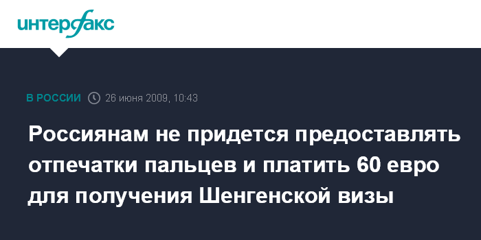 Москва. 26 июня. INTERFAX.RU - Предлагаемая Евросоюзом мера о снятии отпечатков пальцев для получения Шенгенской визы не коснется российских граждан, сообщила в четверг порталу "Интерфакс-Туризм" пресс-секретарь российского союза туриндустрии (РСТ) Ирина Тюрина со ссылкой на консульский департамент МИД РФ. Она напомнила, что между Россией и странами Шенгенского соглашения ранее был подписан отдельный договор об упрощении визового режима для российских граждан, согласно которому виза во все страны Шенгена россиянам обходится в 35 евро.