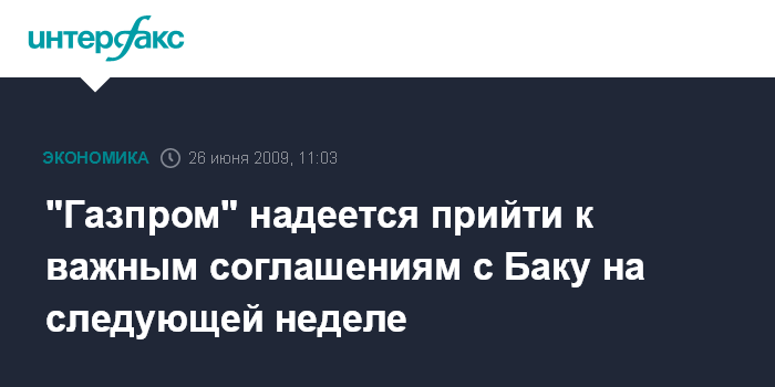 Москва. 26 июня. INTERFAX.RU - ОАО "Газпром" надеется прийти к важным соглашениям с Баку на следующей неделе, сообщил глава "Газпрома" Алексей Миллер на годовом собрании акционеров монополии в пятницу.