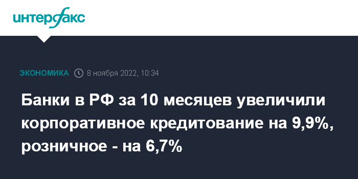 Москва. 8 ноября. INTERFAX.RU - Российские банки за 10 месяцев 2022 года увеличили корпоративное кредитование на 9,9%, розничное - на 6,7%, ЦБ ждет сохранения положительной динамики в темпах кредитования, заявила глава Банка России Эльвира Набиуллина.