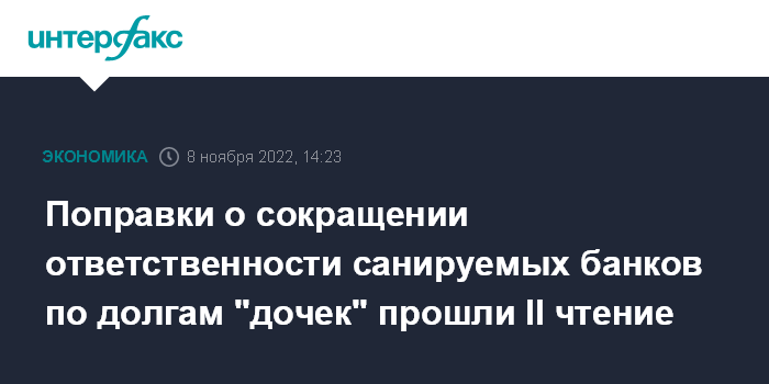 Москва. 8 ноября. INTERFAX.RU - Госдума приняла во втором чтении законопроект, ограничивающий размер субсидиарной ответственности санируемых банков, страховых организаций и негосударственных пенсионных фондов по долгам подконтрольных им юрлиц, если такие обязательства возникли до решения о начале санации.