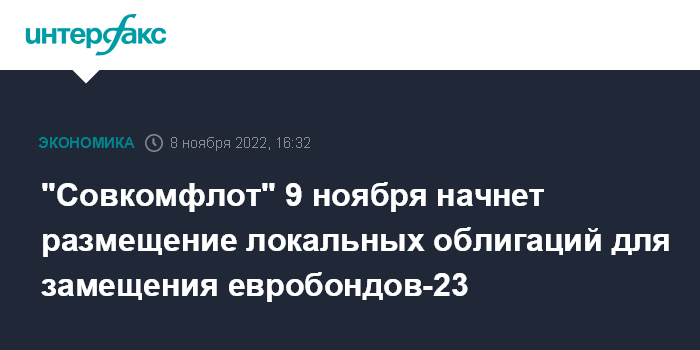 Москва. 8 ноября. INTERFAX.RU - "Совкомфлот" 9 ноября начнет размещение локальных облигаций для замещения выпуска долларовых евробондов с погашением в 2023 году, сообщил эмитент на ленте раскрытия информации.