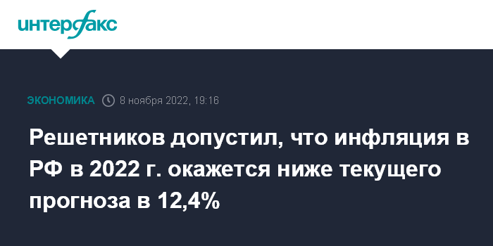 Москва. 8 ноября. INTERFAX.RU - Текущая динамика потребительских цен в РФ указывает на то, что инфляция по итогам 2022 года может оказаться ниже действующего прогноза в 12,4%, ожидается в интервале 12,0-12,4%, заявил глава Минэкономразвития Максим Решетников на совещании по социальным вопросам у президента Владимира Путина.