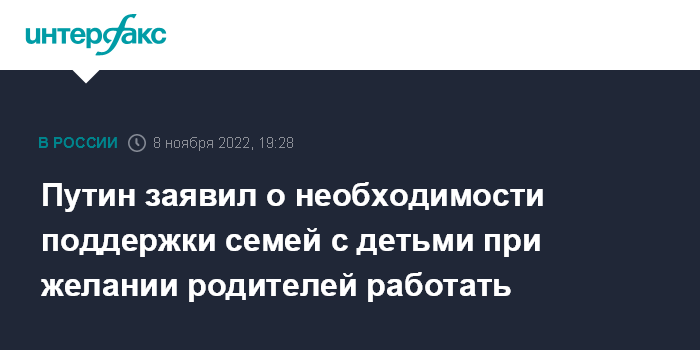 Москва. 8 ноября. INTERFAX.RU - Необходимо поддержать семьи, в которых родители хотят выйти на работу и освоить новую хорошо оплачиваемую профессию, заявил президент РФ Владимир Путин.
