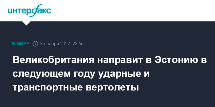 Москва. 8 ноября. INTERFAX.RU - Великобритания направит в следующем году в Эстонию боевые вертолеты и дополнительную боевую группу, сообщил министр обороны балтийской республики Ханно Певкур (Hanno Pevkur).