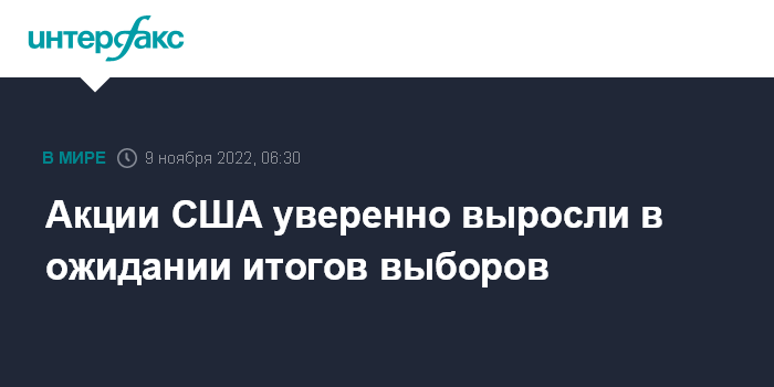 Москва. 9 ноября. INTERFAX.RU - Американские фондовые индексы показали уверенный подъем во вторник, инвесторы ждали итогов промежуточных выборов в Конгресс и данных об октябрьской инфляции в США, а также оценивали большой объем корпоративных новостей.