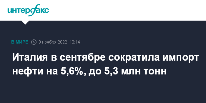Москва. 9 ноября. INTERFAX.RU - В сентябре 2022 года Италия снизила импорт нефти на 5,6% к августу, до 5,261 млн тонн, сообщило Министерство экологического перехода страны.