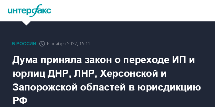Москва. 9 ноября. INTERFAX.RU - Госдума в четверг приняла в третьем, окончательном, чтении закон о порядке и сроках включения индивидуальных предпринимателей и юридических лиц ЛНР, ДНР, Херсонской и Запорожской областей в правовую систему и юрисдикцию РФ