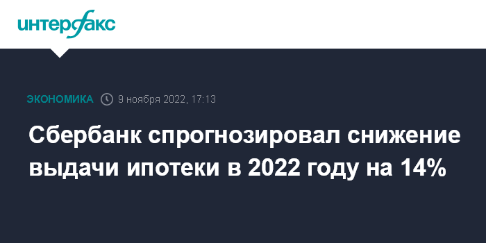Москва. 9 ноября. INTERFAX.RU - Сбербанк прогнозирует снижение выдачи ипотеки в 2022 году по сравнению с 2021 годом на 14%, заявил первый зампред правления банка Кирилл Царев.