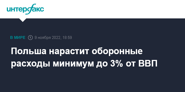 Москва. 9 ноября. INTERFAX.RU - Польша в ближайшее время увеличит расходы на оборону с нынешнего уровня в 2% от ВВП минимум до 3%, заявил в среду польский премьер-министр Матеуш Моравецкий.