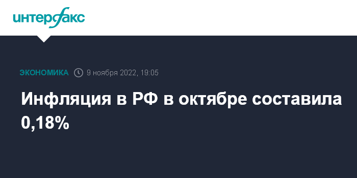 Москва. 9 ноября. INTERFAX.RU - Инфляция в РФ в октябре 2022 года составила 0,18% после инфляции в 0,05% в сентябре, дефляции в 0,52% в августе, дефляции в 0,39% в июле, дефляции в 0,35% в июне, инфляции в 0,12% в мае, 1,56% в апреле, 7,61% в марте, 1,17% в феврале и 0,99% в январе, сообщил в среду Росстат.