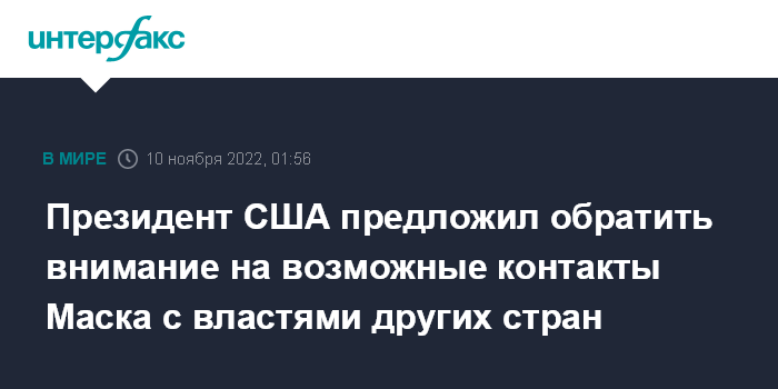 Так Байден ответил на вопрос журналиста о том, нужно ли изучать контакты Маска, в частности, с Саудовской Аравией, в контексте покупки миллиардером Twitter. Ранее некоторые конгрессмены-демократы предполагали, что такие контакты могли бы представлять угрозу для национальной безопасности США.