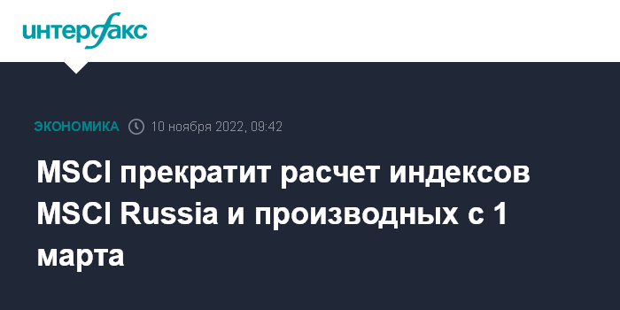 Москва. 10 ноября. INTERFAX.RU - Индексный провайдер MSCI больше не будет предоставлять индексы, которые включают исключительно российские акции.
