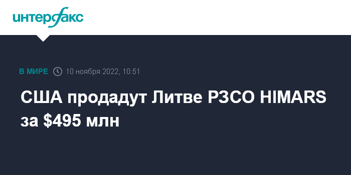 Москва. 10 ноября. INTERFAX.RU - Госдепартамент США разрешил Литве приобрести за предусмотренную сумму в $495 млн (около 493 млн евро) восемь реактивных систем залпового огня HIMARS, сообщило американское Агентство сотрудничества в области безопасности и обороны.