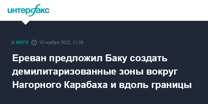 Москва. 10 ноября. INTERFAX.RU - Армения направила Азербайджану предложения о создании демилитаризованной зоны вокруг Нагорного Карабаха и на армяно-азербайджанской приграничной линии, сообщил премьер-министр Армении Никол Пашинян.