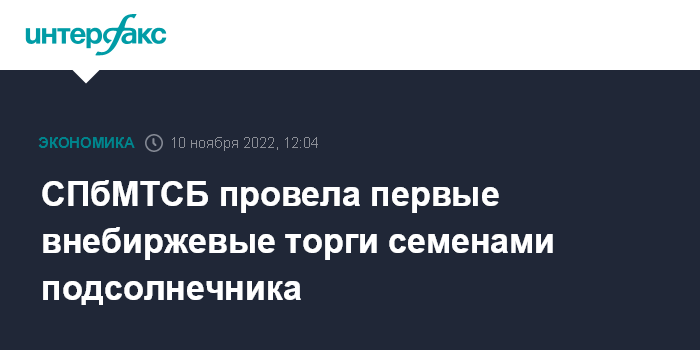 Москва. 10 ноября. INTERFAX.RU - Первые торги семенами подсолнечника прошли на Санкт-Петербургской международной товарно-сырьевой бирже (СПбМТСБ) во внебиржевом сегменте, сообщила Федеральная антимонопольная служба, которая курирует биржевую торговлю товарами.